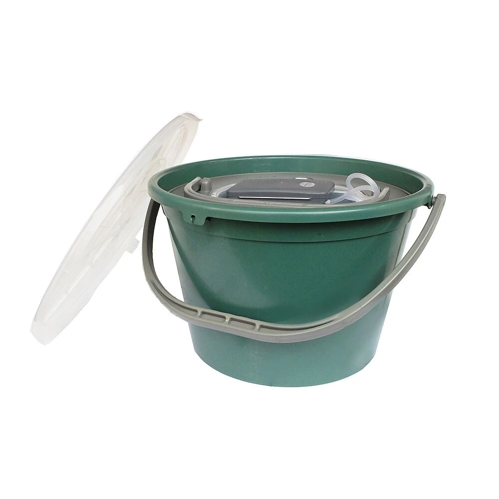 Ronde dubbele aasemmer voor het transporteren van levende vissen.De binnen emmer is voorzien van gaten zodat men het water kan verversen.De emmer wordt geleverd incl een zuurstof pompje die werkt op batterijen.